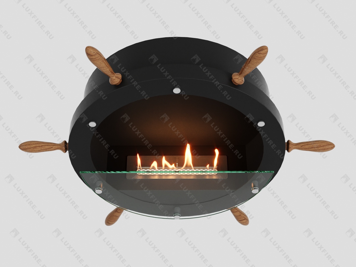 Представляет собой сборную металлическую конструкцию круглой формы класса XS в виде штурвала корабля , создающую полузакрытое безопасное пространство для огня с топливным блоком Lux Fire 250 XS ограниченную закаленным стеклом в котором горит живой огонь с углом обзора 180 градусов. Универсально подходит для встройки в нишу или подвеса на стену.
